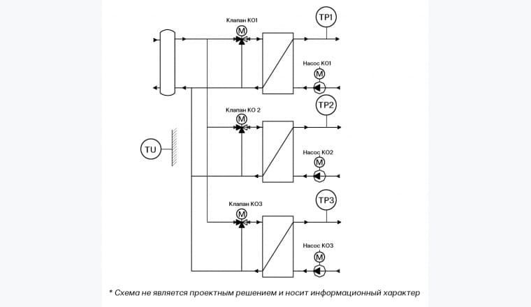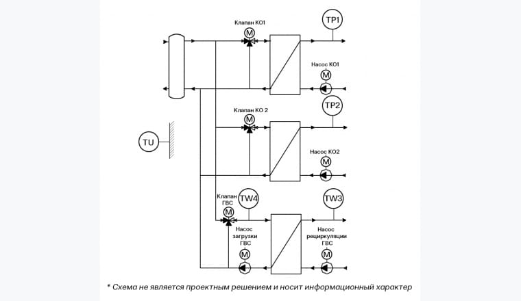 В контроллер установлено прикладное программное обеспечение (ПО) ООО «ЭНТРОРОС», выполняющее сбор и обработку данных, заведённых в ПЛК; по этим данным формируются алгоритмы управления контурами отопления (КО).