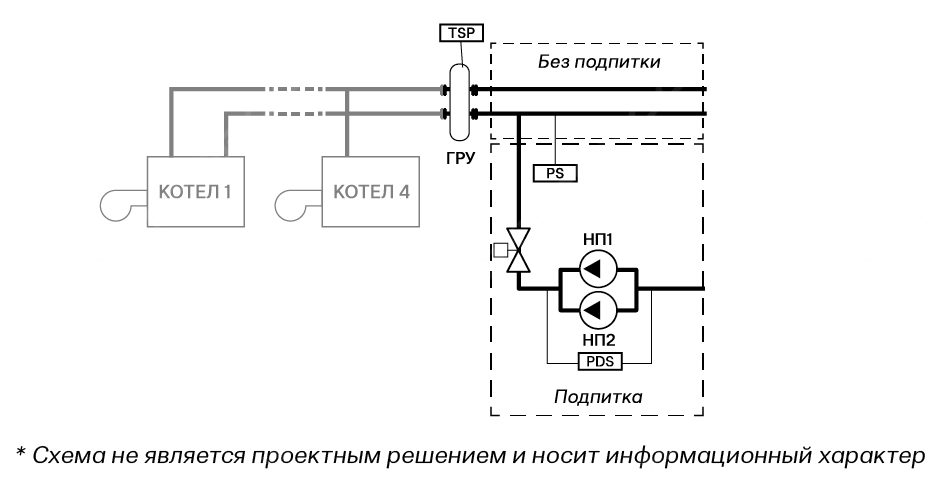 - контроль давления теплоносителя в общем трубопроводе по верхнему и нижнему уровню;