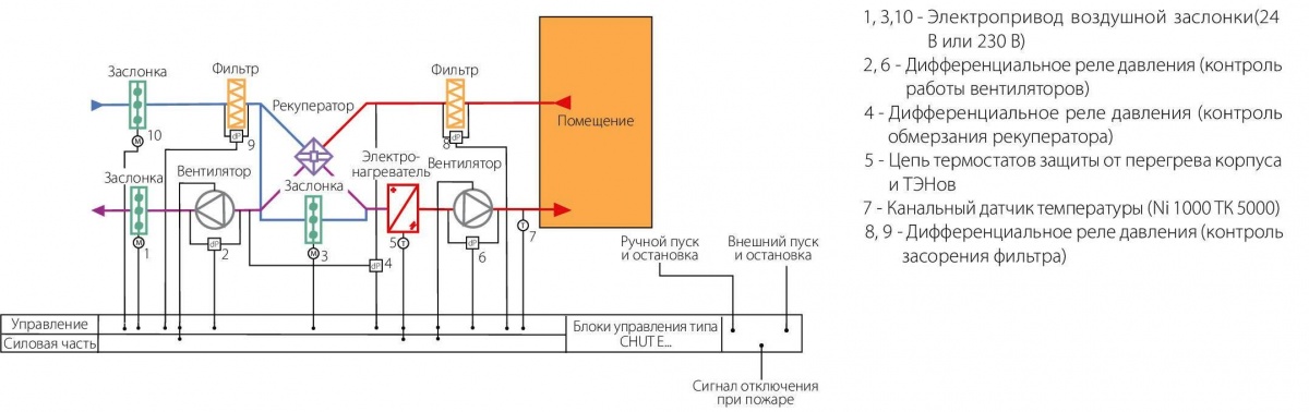 Блок управления CHUT-E22-31 предназначен для управления приточно-вытяжной установкой вентиляции с нагревателем приточного воздуха электрического типа (электрическим воздухонагревателем - калорифером).