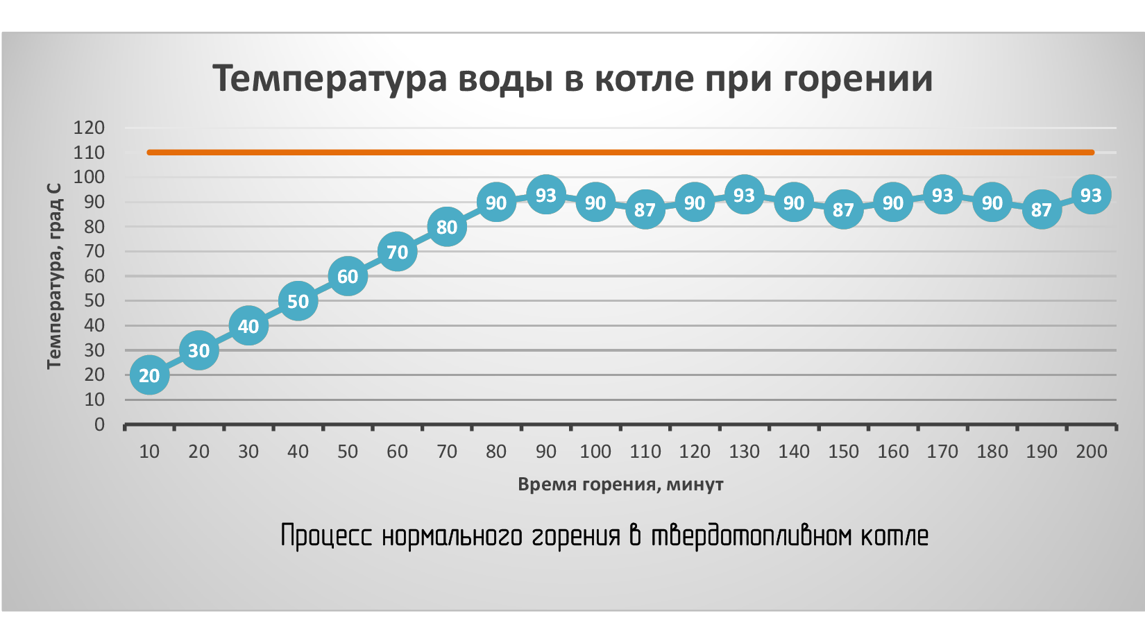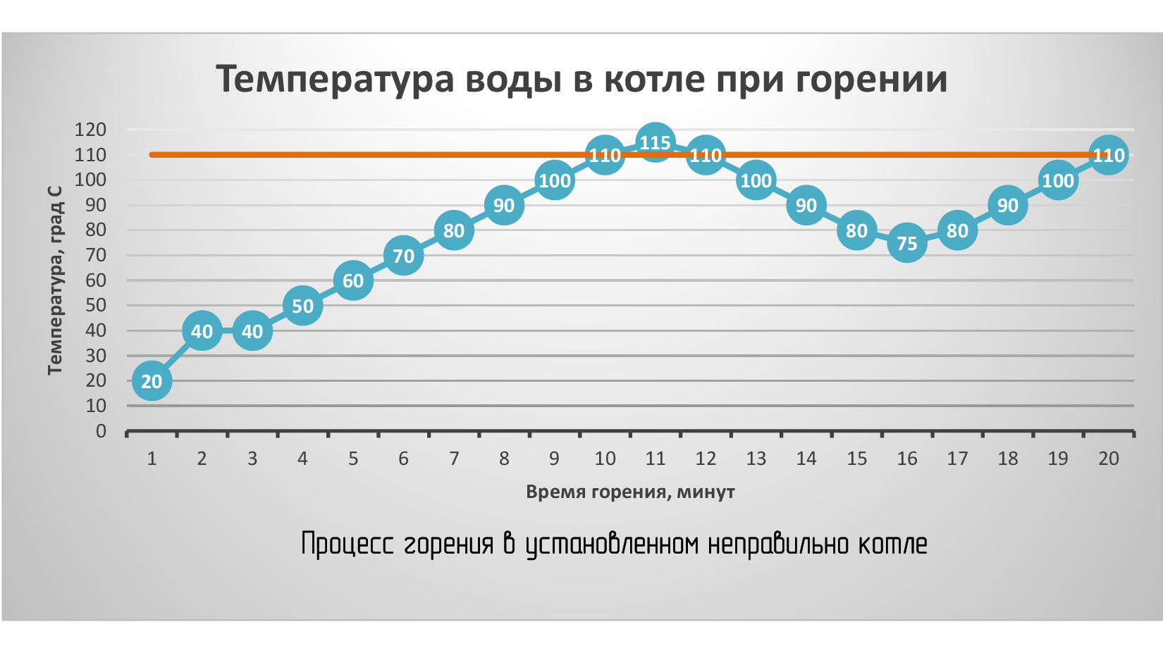 Ниже представлены графики нормального процесса горения в твердотопливном котле, и неправильного (при неверной обвязке и завышенной мощности котла), ведущего к аварийной работе котла.