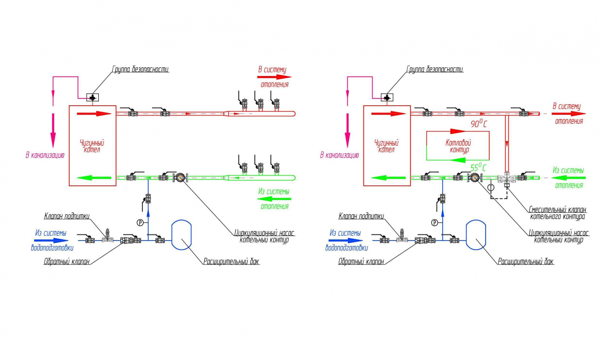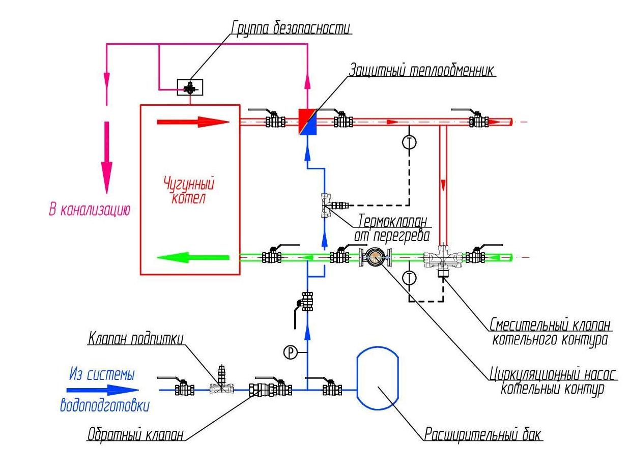 Схема обвязки и подключения чугунных котлов - газовых и твердотопливных